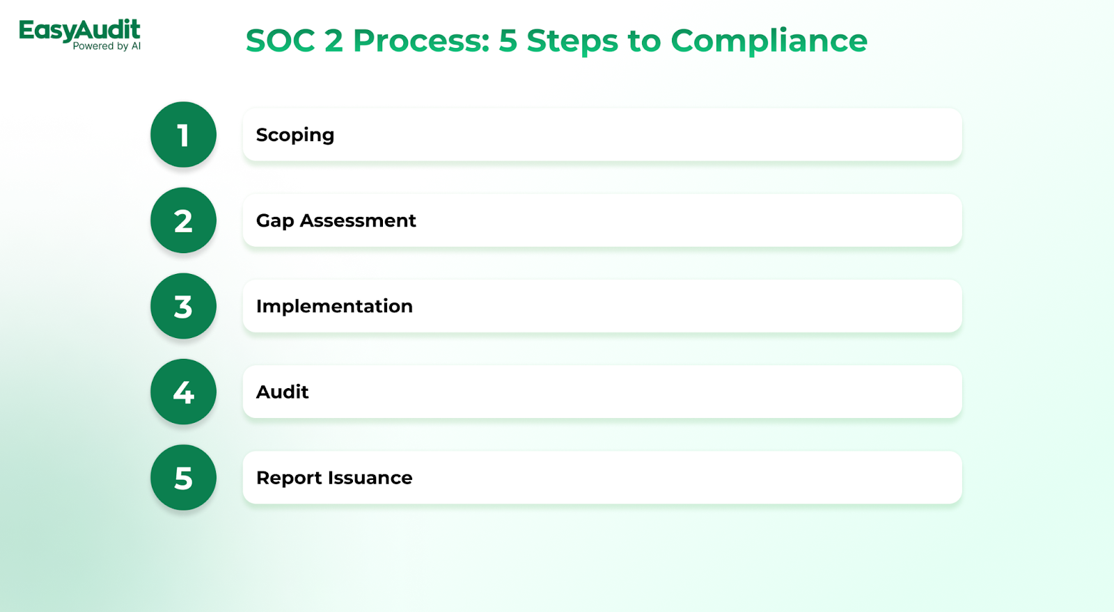 Report Issuance : Receive the SOC 2 report, which may be Type I (point-in-time) or Type II (over a review period).