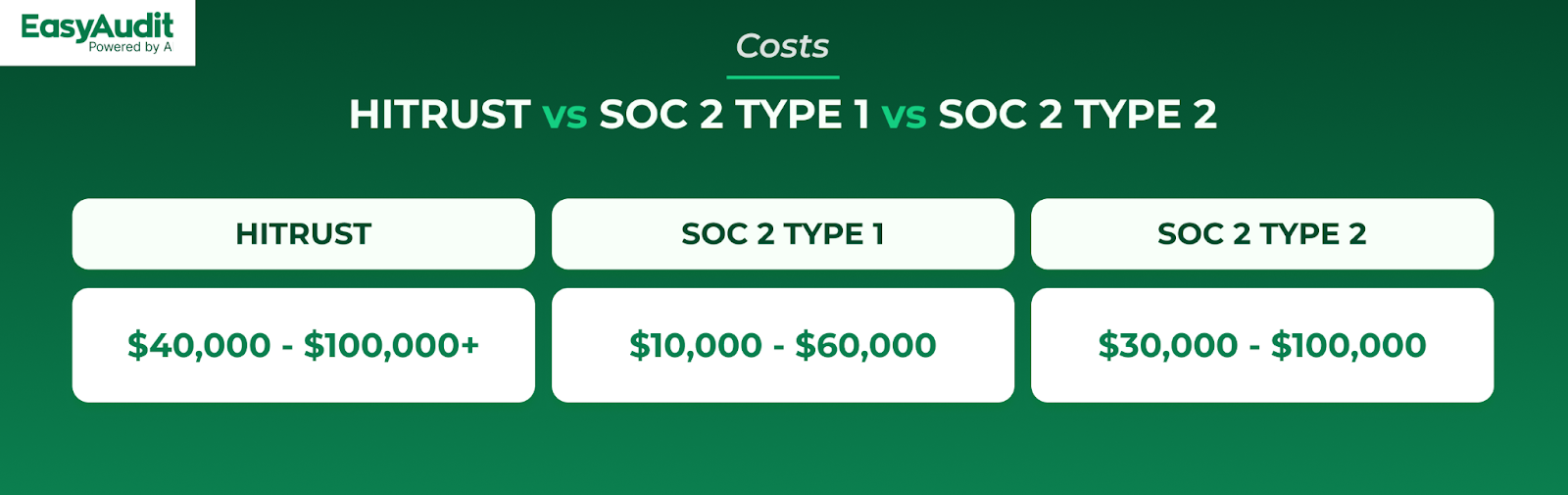 HITRUST: Certification can be costlier due to its comprehensive nature, ranging from $40,000 to over $100,000 depending on scope and organization size.
