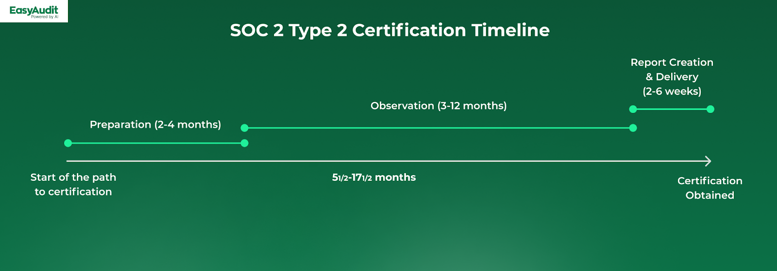 The timeline for achieving SOC 2 Type 2 certification is roughly five and a half to 17 and a half months long, consisting of a preparation phase, observation period and the official audit, followed by certification delivery if passed.