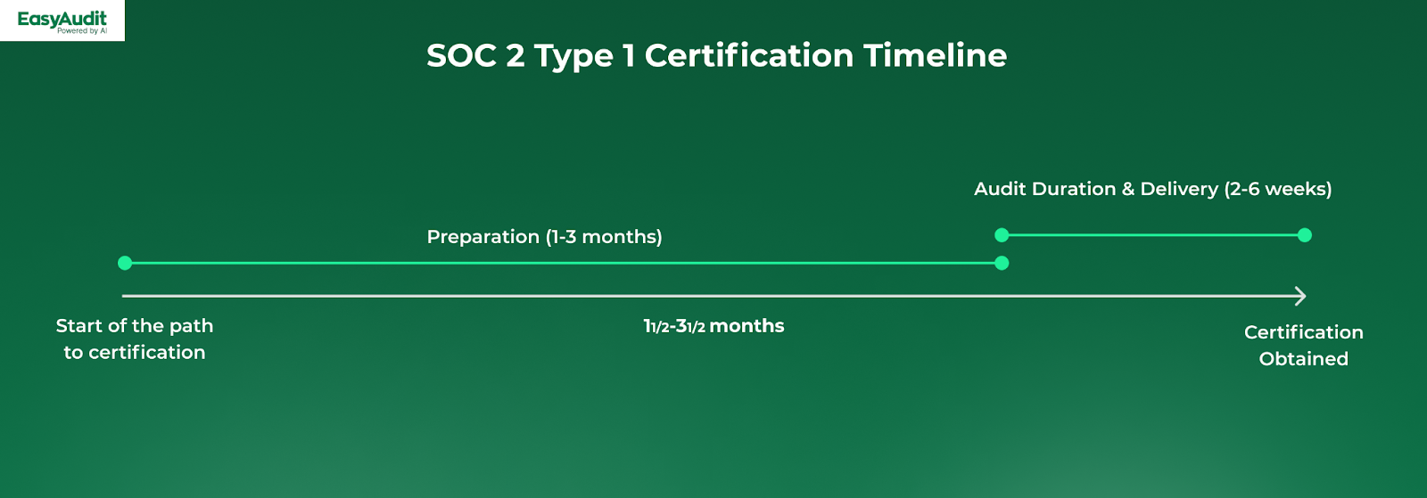 The timeline for achieving SOC 2 Type 1 certification is roughly one and a half to three and a half months long, consisting of a preparation phase and the official audit, followed by certification delivery if passed.