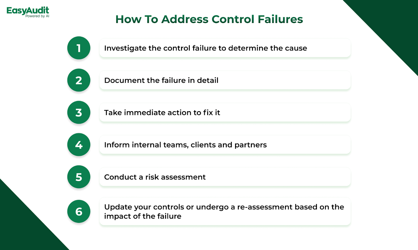 If a control failure occurs, it’s important to act quickly to assess the issue and implement corrective actions. Here’s how to address control failures effectively: