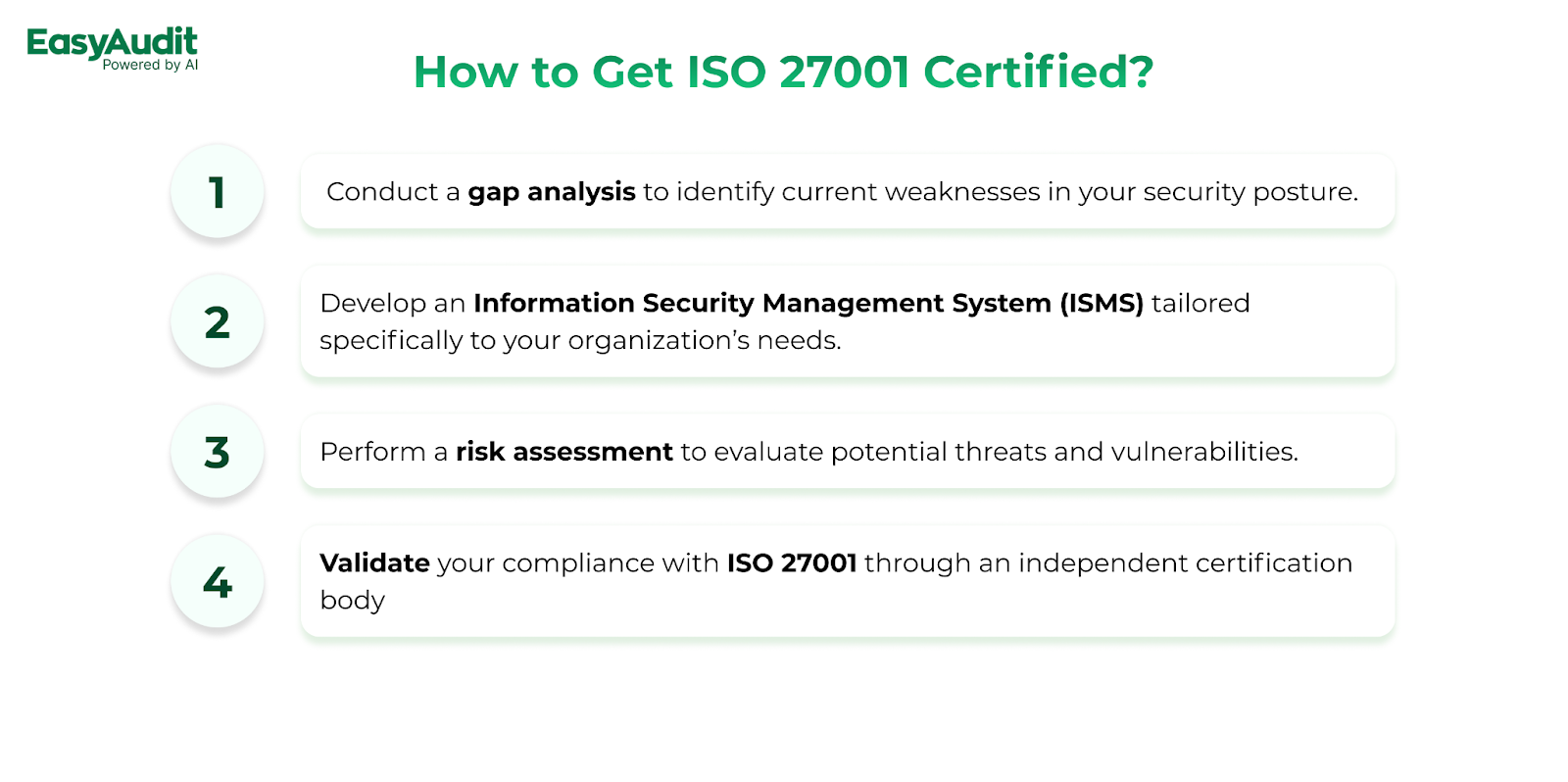For ISO 27001 certification, the process begins with conducting a gap analysis to identify current weaknesses in your security posture.