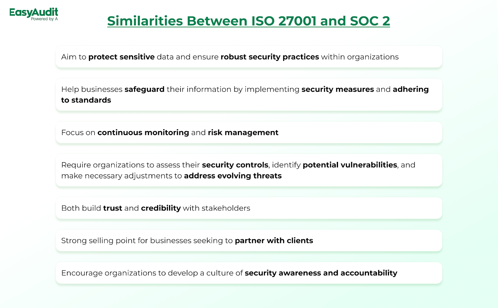 Both ISO 27001 and SOC 2 require organizations to regularly assess their security controls, identify potential vulnerabilities, and make necessary adjustments to address evolving threats.