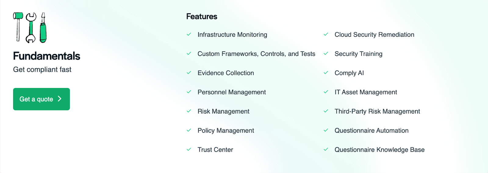Secureframe has two pricing plans - Fundamentals and Complete.