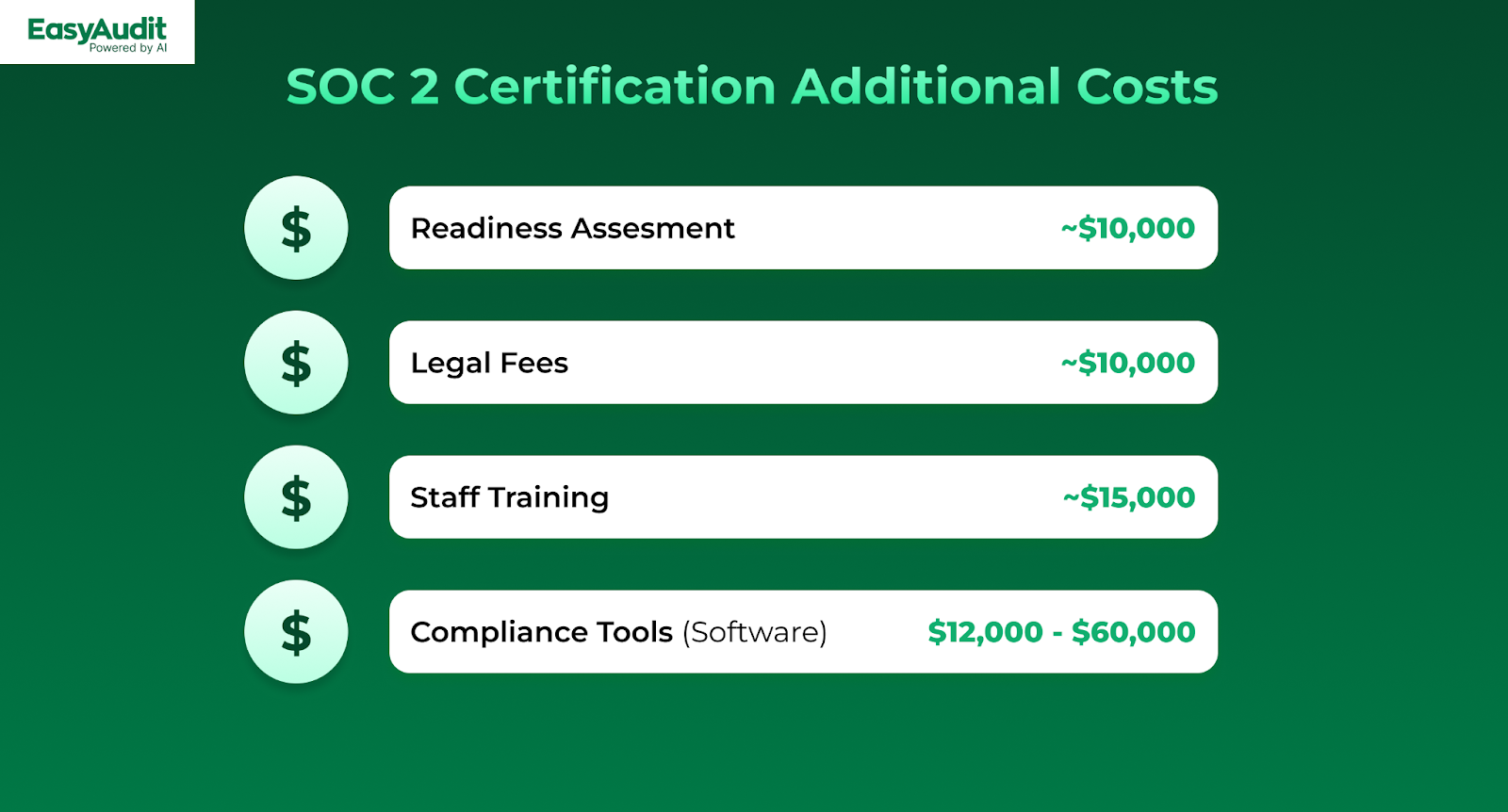 For example, a mid-sized tech company might spend $15,000 on the audit, plus an extra $10,000 on new security software, such as Data Loss Prevention and Encryption Software, and Vulnerability Assessment tools.