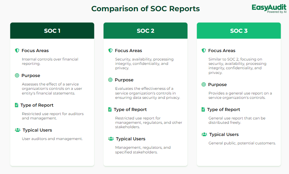 What It Covers : Controls over security, availability, processing integrity, confidentiality, and privacy (the Trust Services Criteria).