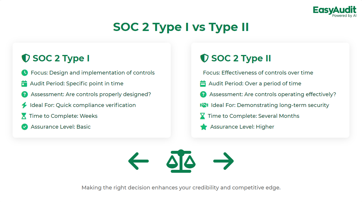 Type II : This is the full documentary. It evaluates not only the design but also the operating effectiveness of those controls over a period — usually six months to a year. It proves your controls don't just look good on paper; they perform in the real world.