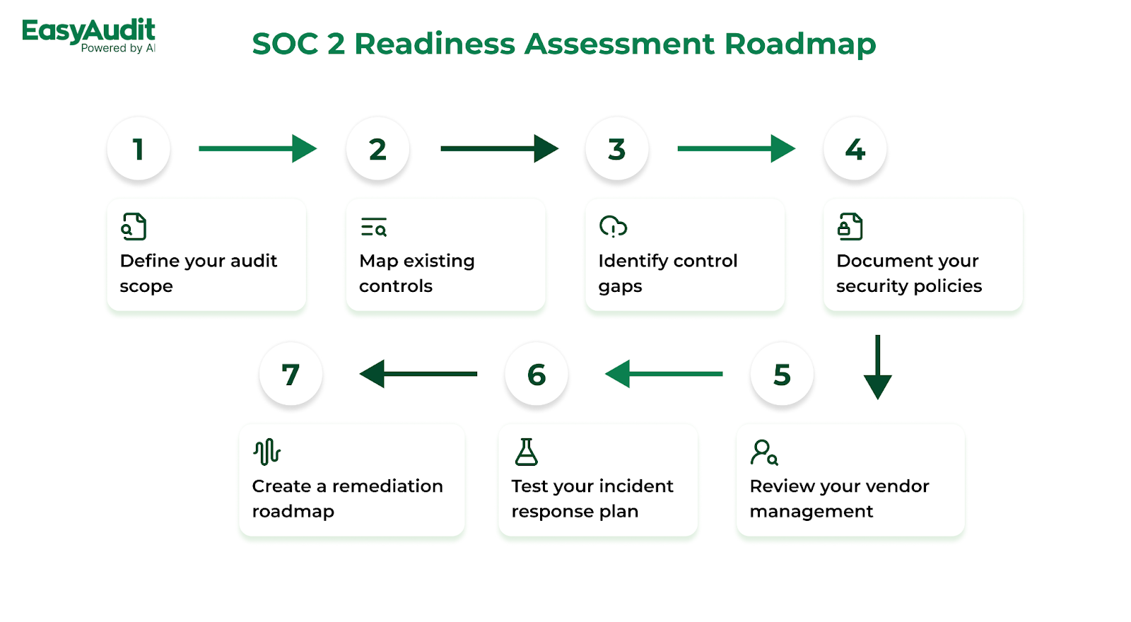Preparing for your SOC 2 readiness assessment involves taking a structured approach to evaluate your organization’s current policies, procedures, and security controls against the Trust Services Criteria (TSC). Here is a step-by-step process to follow: