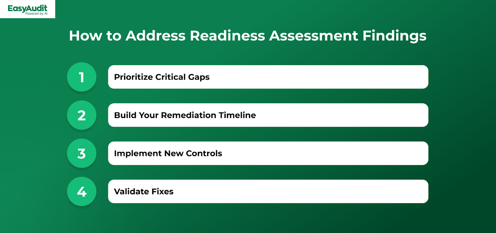 Gaps can exist in areas like data access management, incident response, or encryption practices. Identifying these gaps early helps you address weaknesses prior to the official audit.