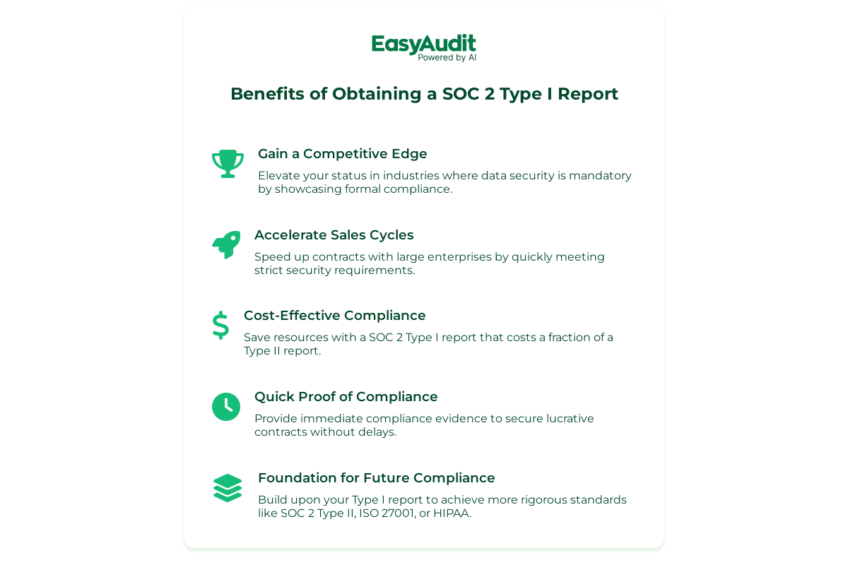 With EasyAudit, you can fast-track your SOC 2 Type 1 report, allowing you to focus on closing deals and expanding your business.