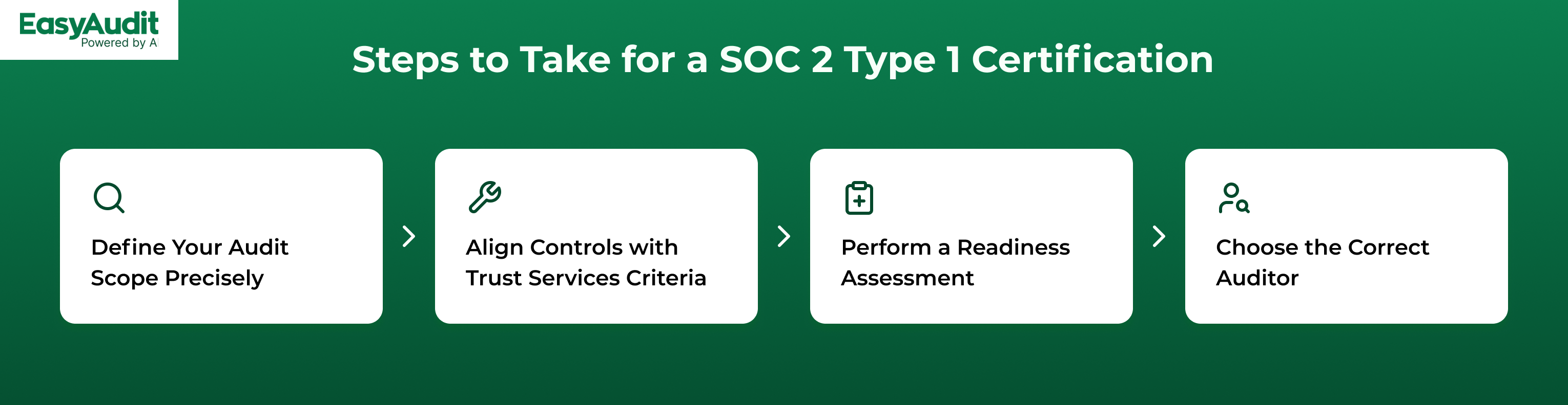 Understand the SOC 2 Type 1 Scope : Focus on the design effectiveness of controls related to the Trust Services Criteria.
