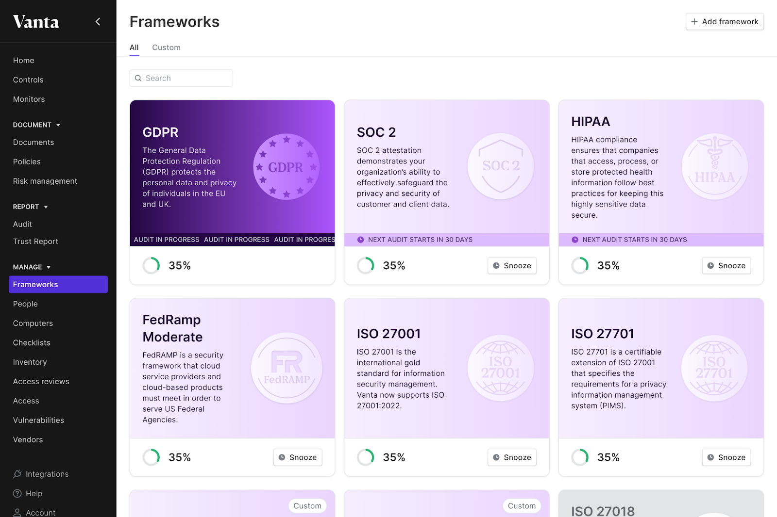 Vanta leans toward self-service, great for teams that want to click around, follow pre-set guides, and move quickly. They offer: