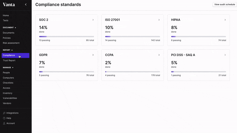 When it comes to frameworks, Vanta keeps things tight and tidy, perfect for startups and scaling SaaS teams. You get support for the usual suspects: SOC 2, ISO 27001, HIPAA, GDPR, and PCI DSS. These frameworks are prebuilt into intuitive templates that can get you audit-ready fast, especially if your primary goal is “get compliant so we can close this deal.”